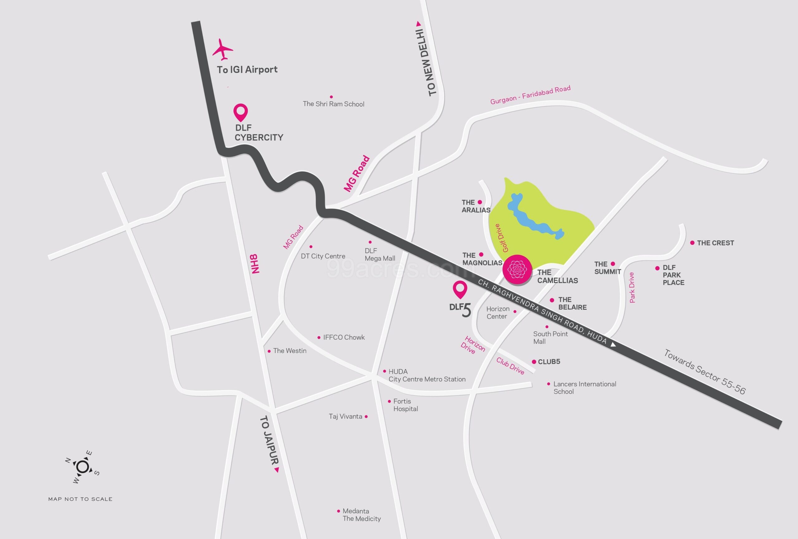 Located on Golf Course Road in Sector 42, DLF The Camellias offers unbeatable access to business hubs, top schools, reputed hospitals, and Gurgaon’s best shopping and dining destinations. The property is just minutes from Cyber City, Golf Course Extension Road, and NH-8, making it perfect for working professionals and families seeking ultra-luxury living in Gurgaon.